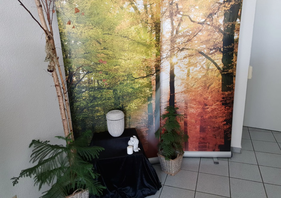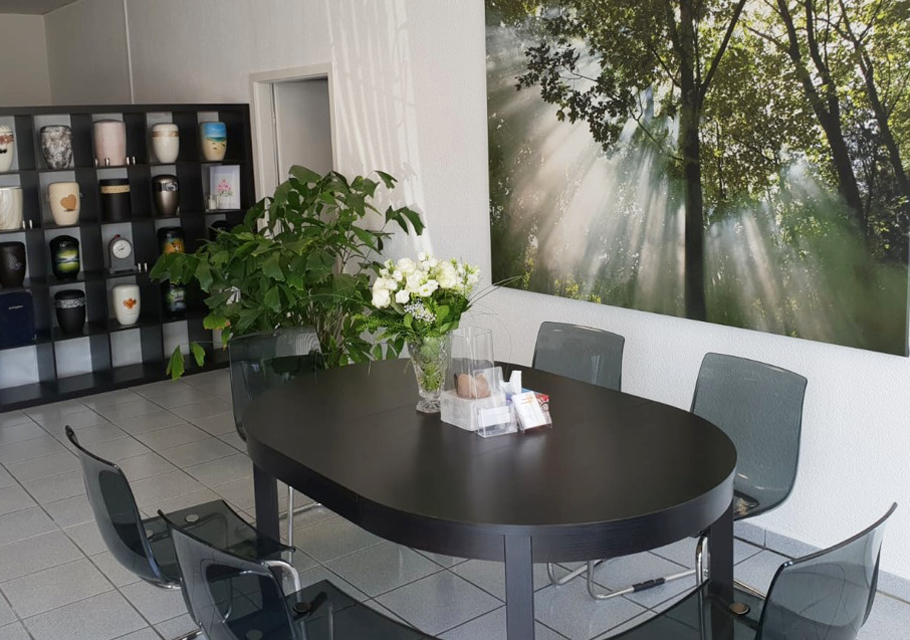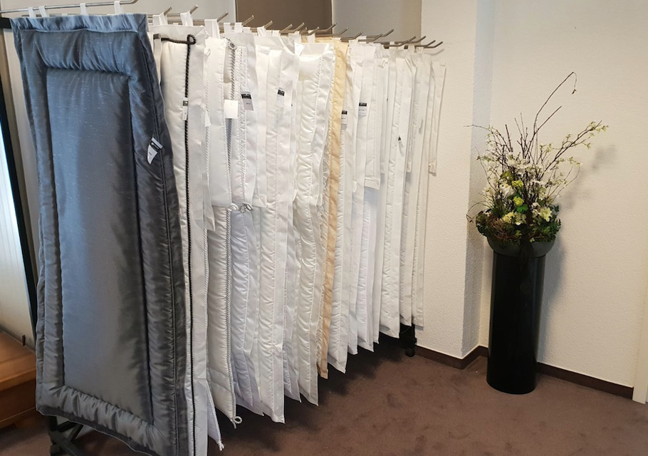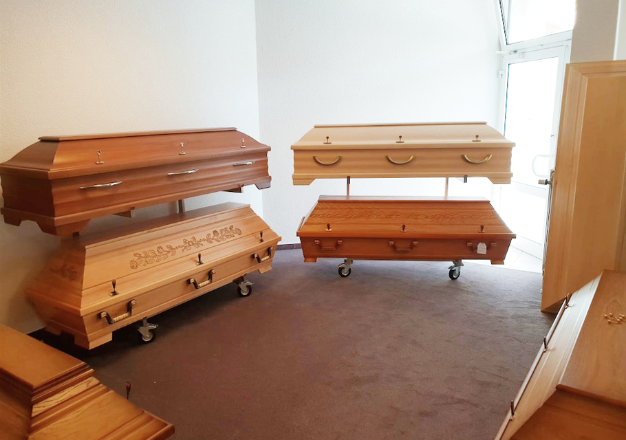 In unseren eigenen Ausstellungsräumen finden Sie eine große Auswahl von Särgen und Urnen mit verschiedensten Materialien und Formen. Ebenso Deckengarnituren oder Sterbewäsche. Wir unterstützen Sie gerne bei der Auswahl. Selbstverständlich haben wir darüberhinaus das komplette Angebot in Katalogform für Sie bereit, wenn wir Sie zu Hause besuchen und beraten.